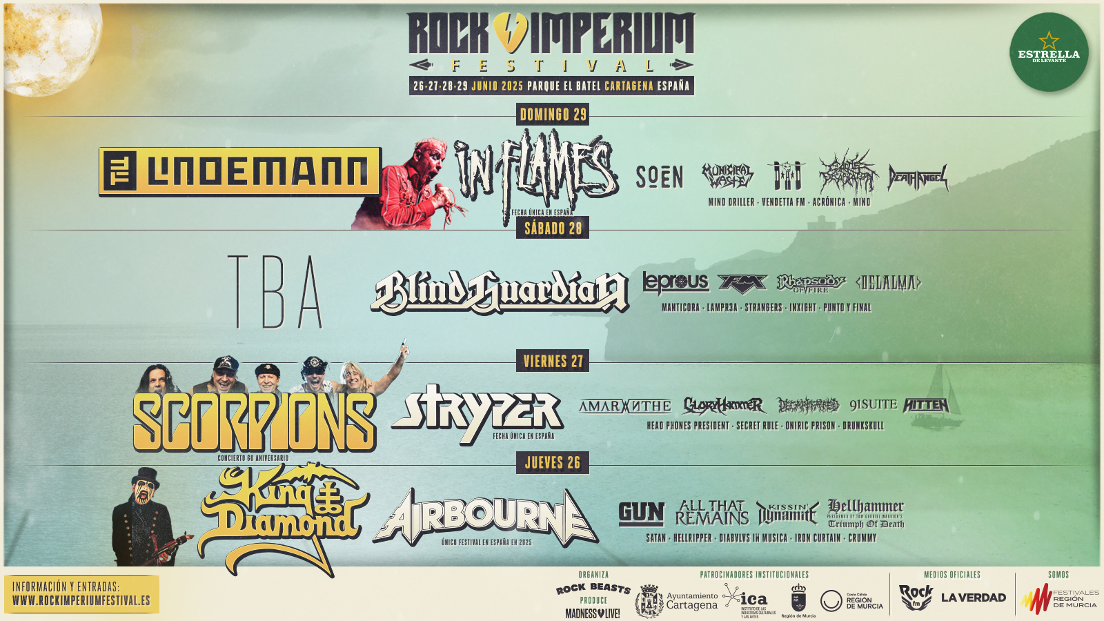 Rock Imperium Festival 2025 closes its lineup, with just one band missing, with an impressive batch of confirmations. Scorpions, celebrating their 60th anniversary, will be one of the highlights of the edition, along with the long-awaited debut in Spain of Till Lindemann (vocalist of Rammstein) and the exclusive performance of Stryper. They are joined by other highly renowned bands such as Leprous, Municipal Waste, Death Angel, Hitten and Mind Driller. With one big band yet to be confirmed, the new artists join the already announced King Diamond, Airbourne, In Flames and Blind Guardian, as well as more than 30 bands that complete a luxury lineup for 2025.