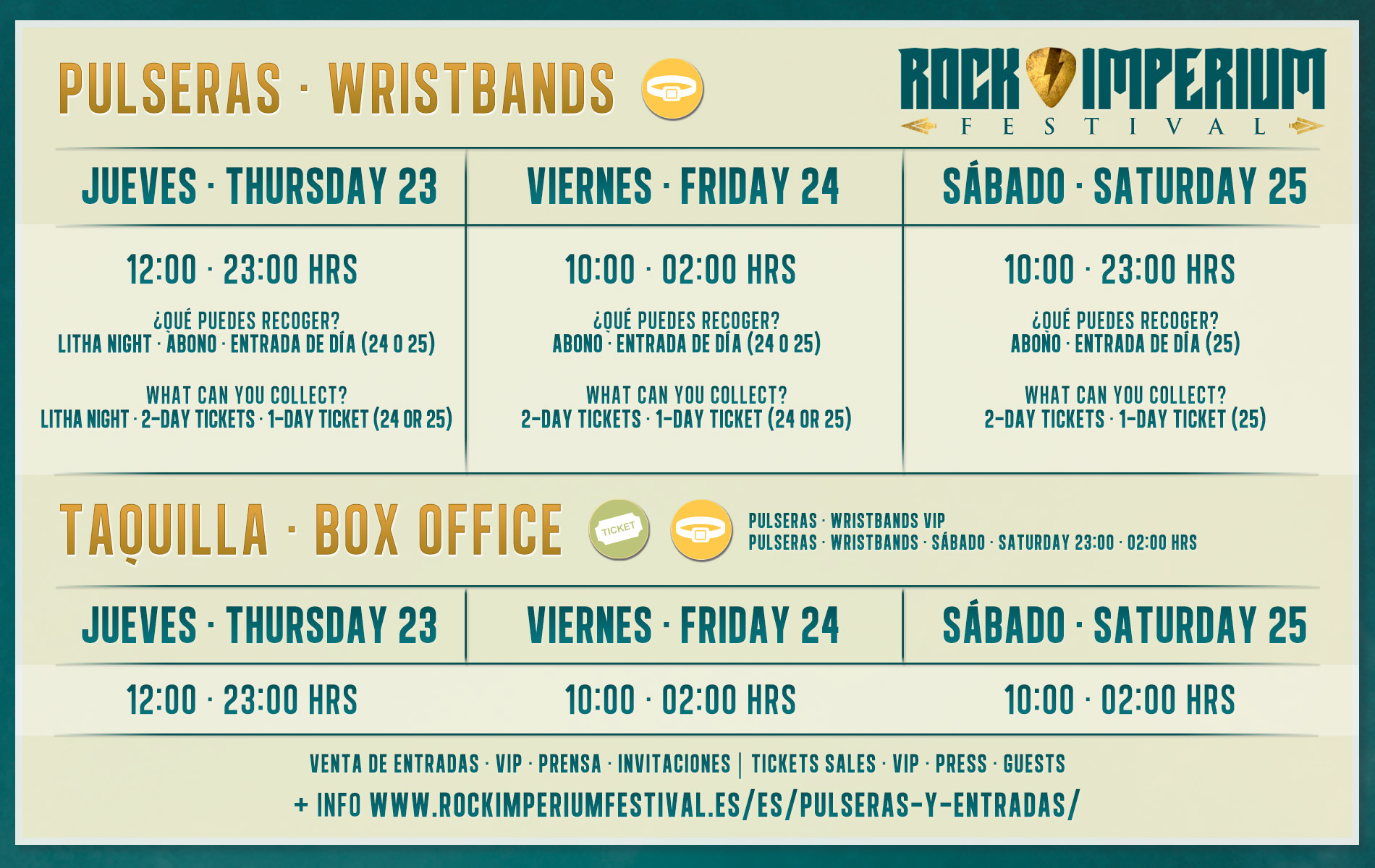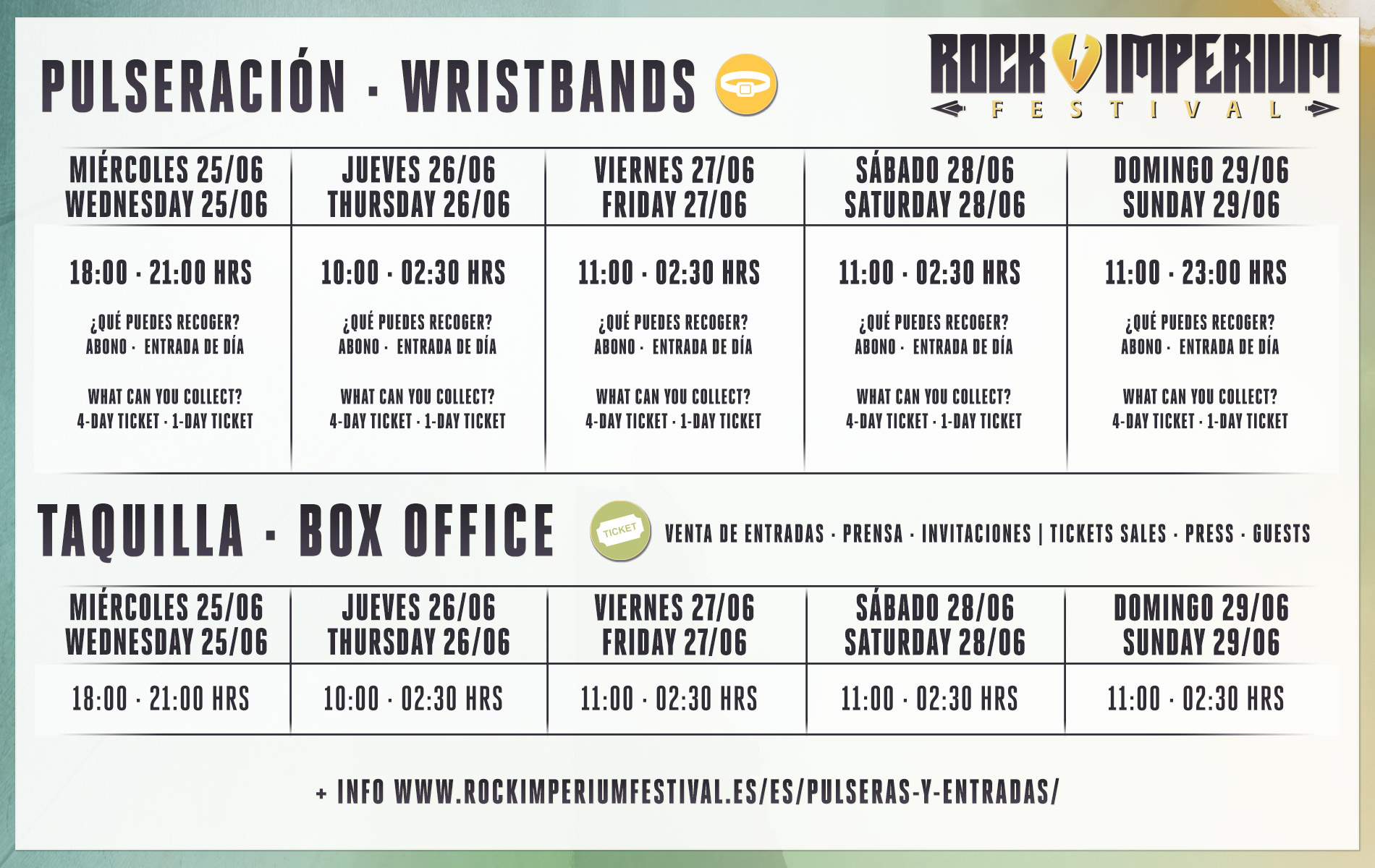 Aquí puedes consultar los horarios de actuación de las bandas y también la hora de comienzo de pulseración. https://www.rockimperiumfestival.es/es/horarios/