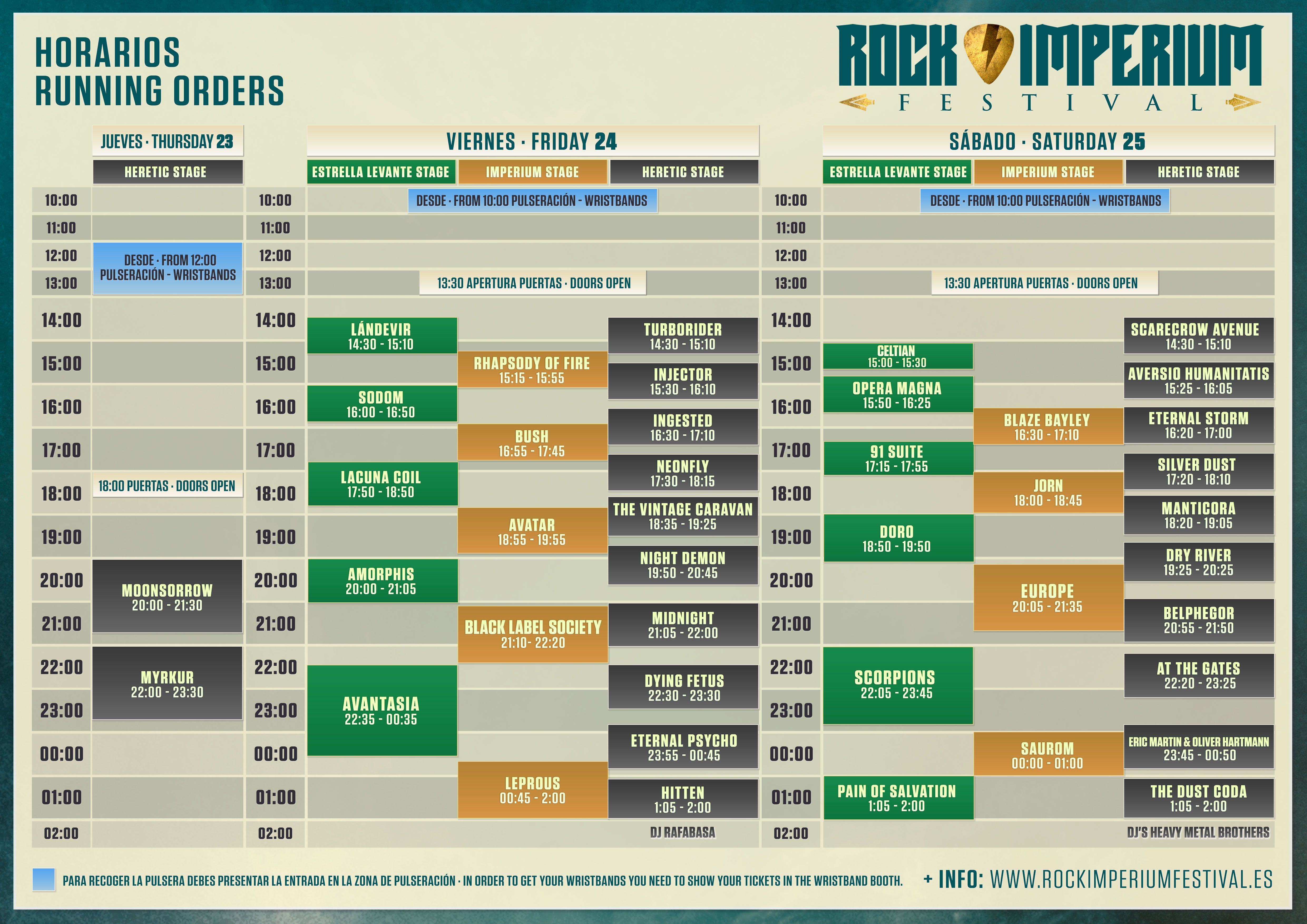 Aunque la apertura de puertas los días 24 y 25 tendrá lugar a las 13:30 horas, es interesante tener en cuenta que la pulseración comenzará a las 10 de la mañana en la zona designada para tal efecto, por lo que os sugerimos encarecidamente pasar a recoger las pulseras con suficiente antelación para evitar aglomeraciones y colas innecesarias.