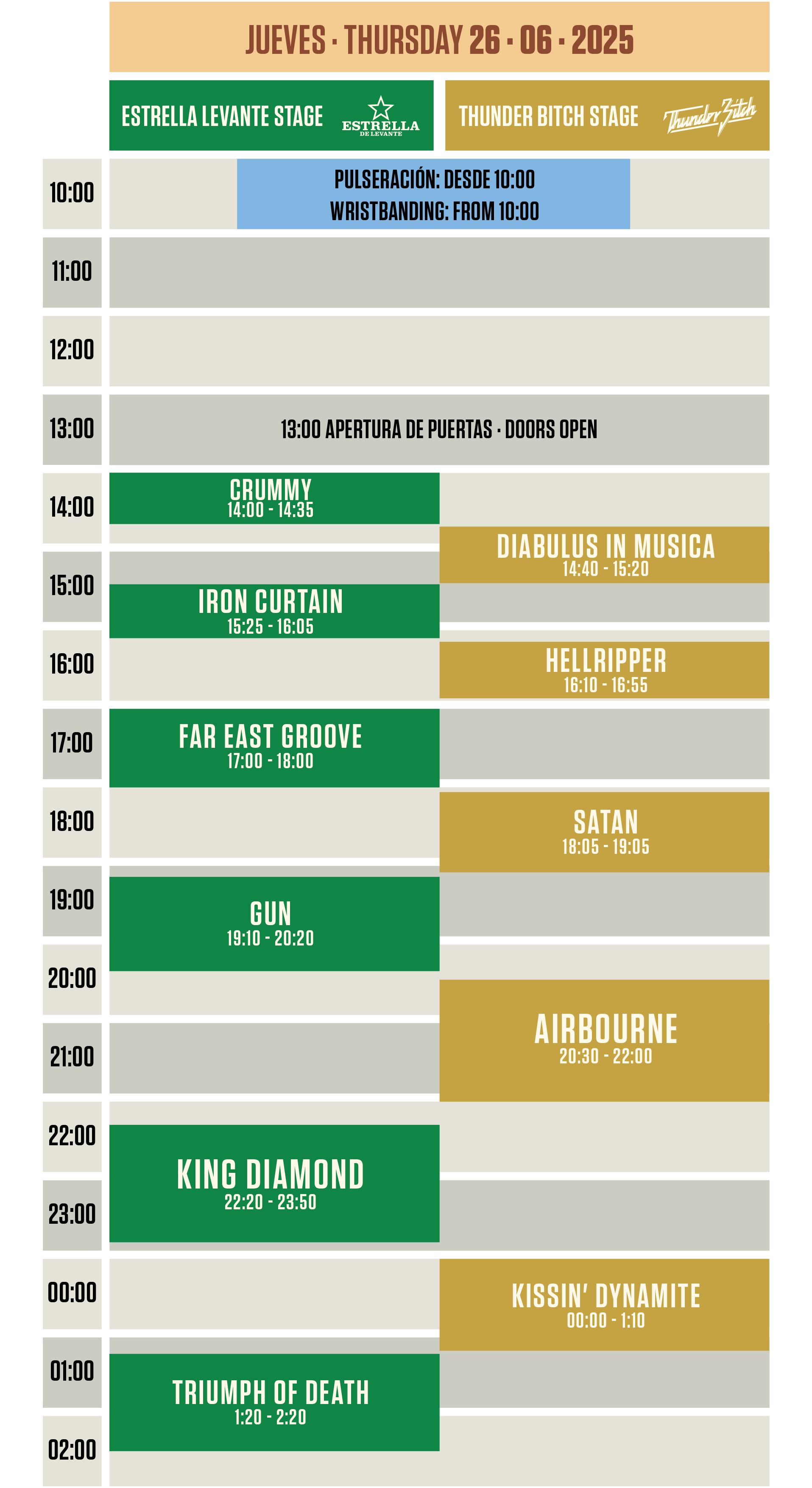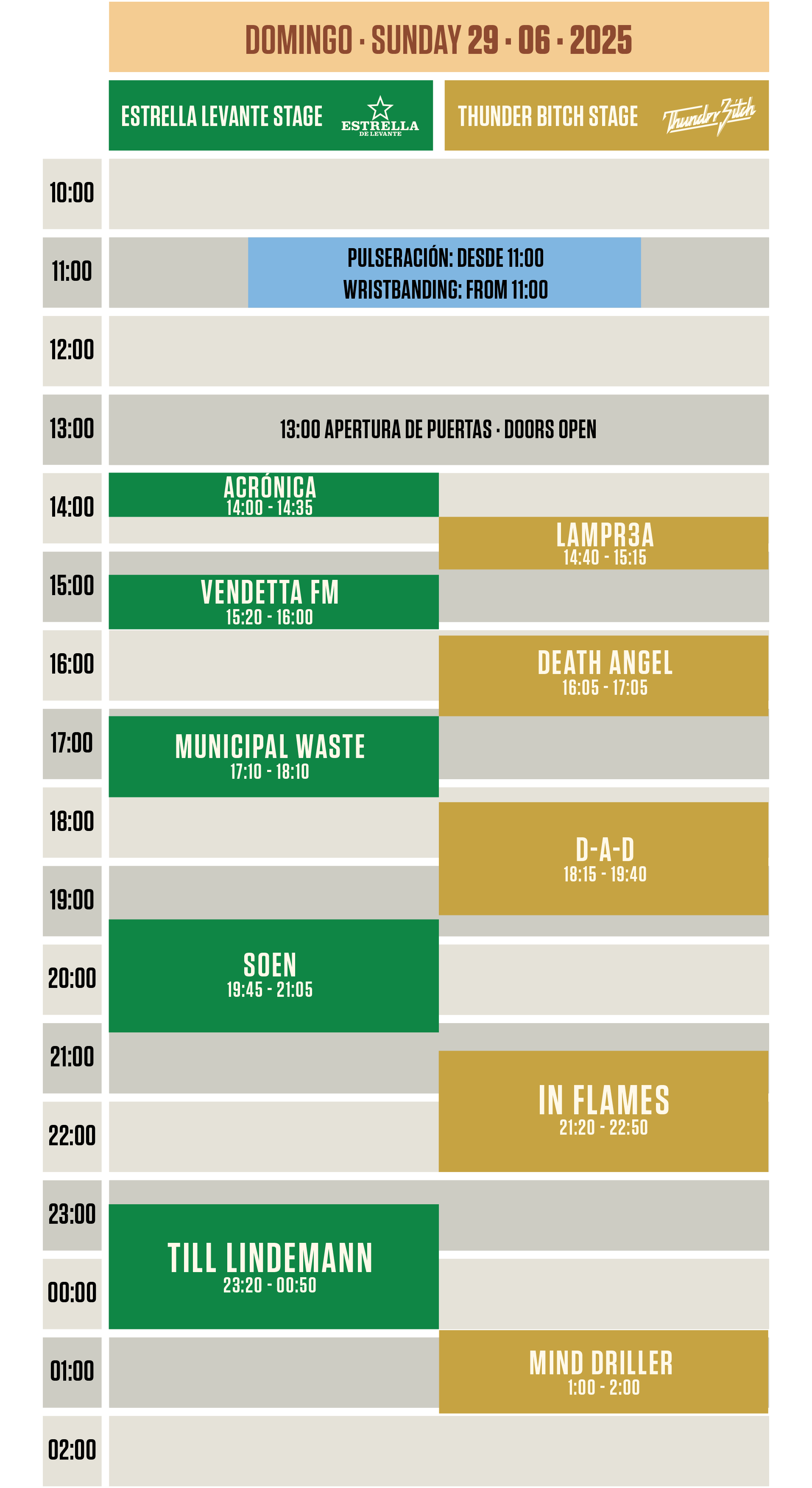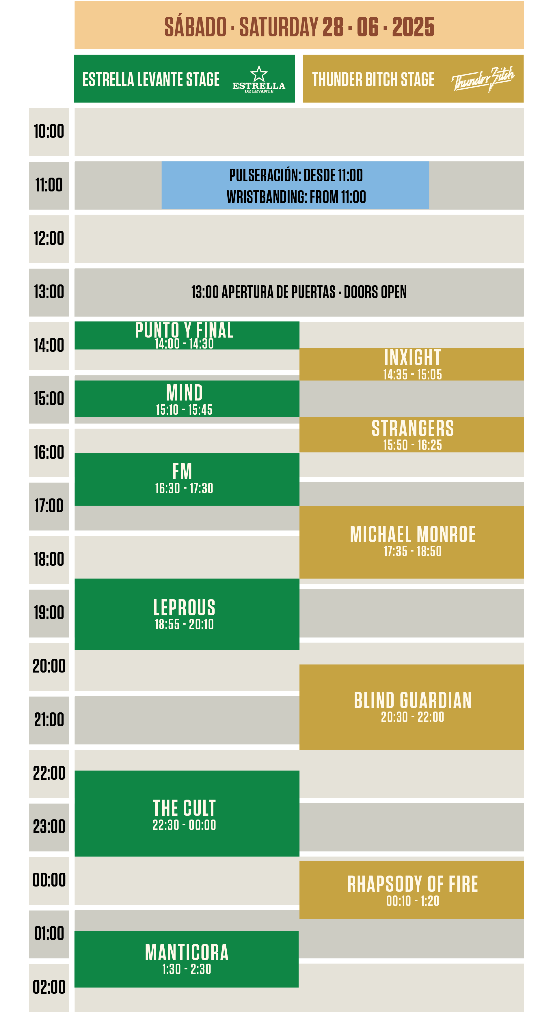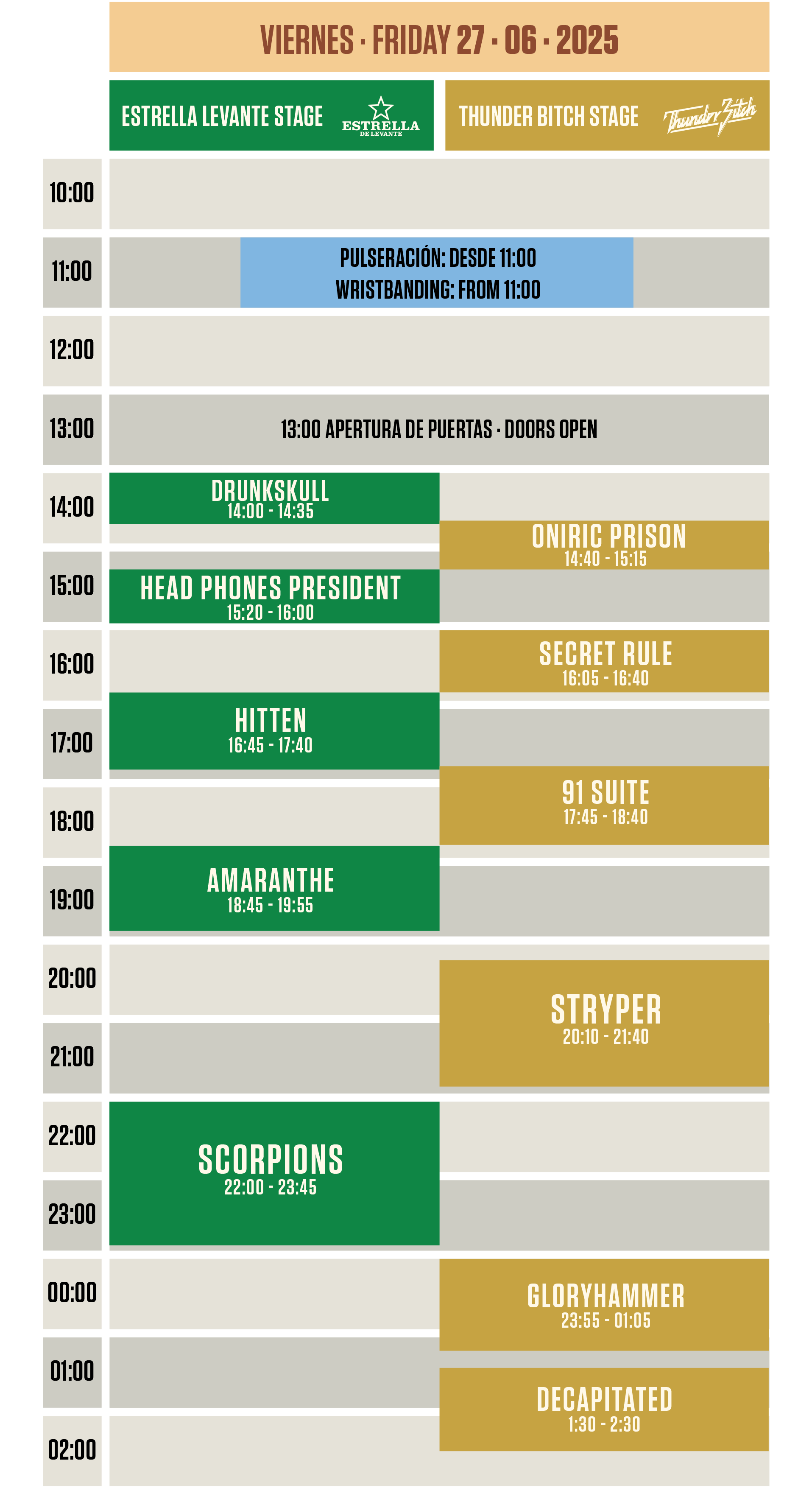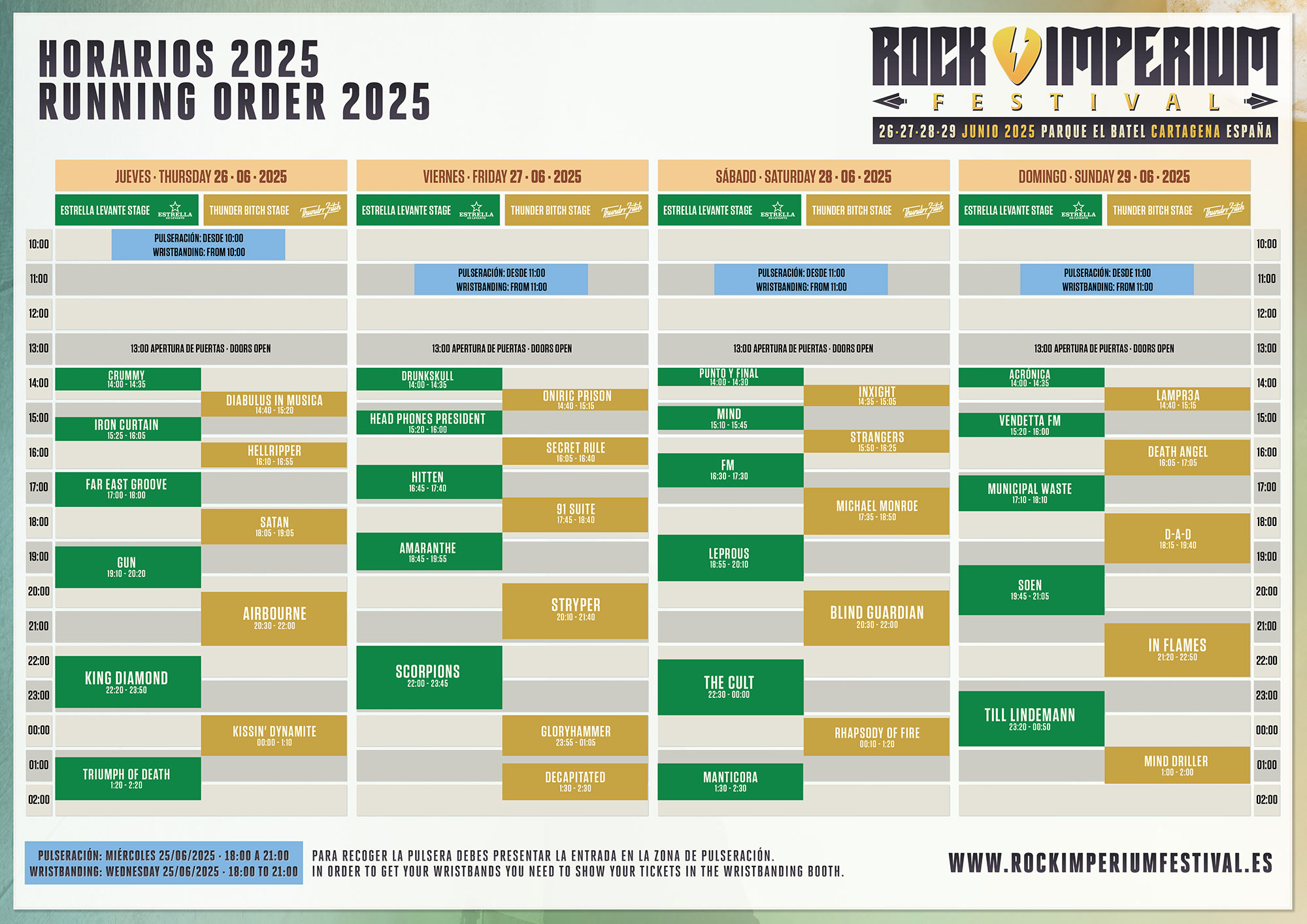 Aunque la apertura de puertas tendrá lugar a las 13:00 horas, es importante tener en cuenta que la pulseración comenzará antes en la zona designada para tal efecto cada día, incluyendo el miércoles 25 de 18:00 a 21:00 horas, por lo que os sugerimos encarecidamente pasar a recoger las pulseras con suficiente antelación para evitar aglomeraciones y colas innecesarias.