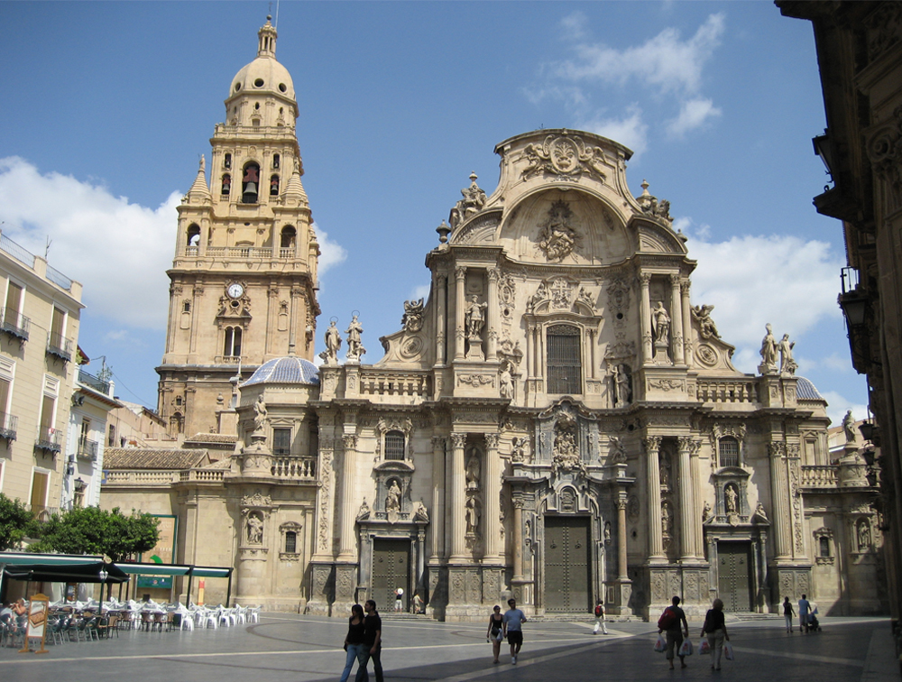 Con una planta e interior góticos, resulta imposible no destacar la torre del campanario, la segunda más grande del país después de la Giralda de Sevilla que, acogiendo los estilos renacentista, plateresco y neoclásico se erige en símbolo indiscutible de toda la región. Por otra parte, su fachada principal es una de las portadas barrocas más impresionantes de España. Orientada a occidente, a los pies del imponente imafronte se extiende la Plaza del Cardenal Belluga, repleta siempre de vida y bordeada por el hermoso Palacio Episcopal del siglo XVIII de estilo rococó.